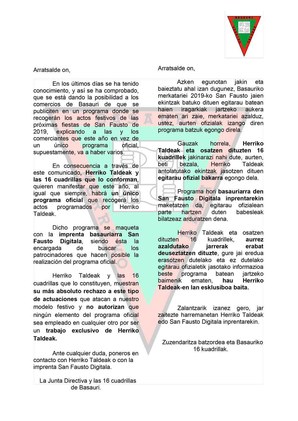 Herriko Taldeakek komunikatu ofiziala atera behar izan du gaur arratsaldean bertan. Oharrean adierazi dutenez, “azken egunotan jakin ahal izan dugunez, 2019ko San Fausto jaien ekintzak batuko dituen egitarau batean merkatariek iragarkiak jartzeko aukera ematen ari zaie, merkatariei azalduz, ustez, aurten egitarau ofizialak izango diren beste programa batzuk egongo direla”. Ildo horretan, Herriko Taldeakek ukatu du beste programa ofizial batzuk argitaratuko direla, eta aurreko urteetan bezala, aurten ere jai egitarau ofizial bakarra egongo dela jakinarazi dute.