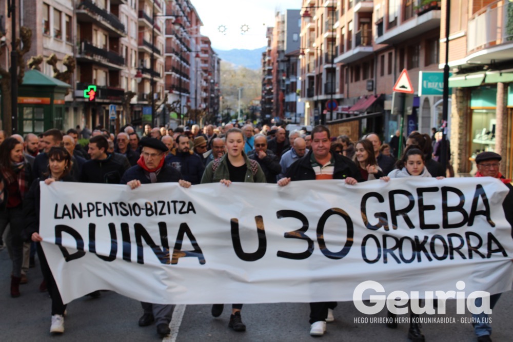 Urtarrilaren 30ean greba orokorra deitu dute Euskal Herrian. Lan, pentsio eta bizitza duinaren aldeko greba orokorra izango da, eta horren harira, hilaren 18an manifestazioa egin dute Galdakaon, bertako greba komiteak antolatuta. Manifestaziora 300 lagun inguru batu da. “Honek alargunaren, pentsionistaren, langilearen, autonomoaren, langabetuaren, etorkizun bat eraiki nahi duen gaztearen, irakaslearen, ikaslearen, zaintzailearen eta abar askorengan eragina du. Guztiongan eragina du. Horregatik, lan, pentsio eta bizitza duinen baldintzen alde borrokatzea beharrezkoa ikusten dugu, eta zentzu honetan, urtarrilaren 30a borroka hauek guztiak barnebiltzen dituen eguna izan behar dela aldarrikatzen dugu”, dio Oihane Apellaniz Galdakaoko greba komiteko kideak.