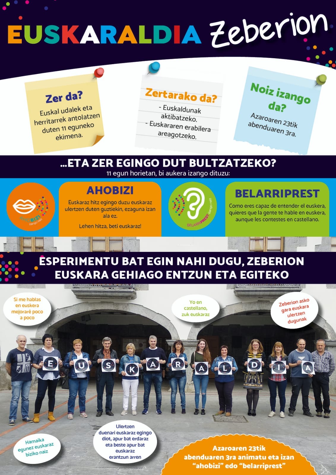 Bi rol nagusi proposatu ditu Euskaraldiak 11 egun horietarako. Ahobizi: “Ulertzen duenari euskaraz egingo diot, hark erdaraz erantzun arren. Ezezagunei lehen hitza, gutxienez, euskaraz egingo diet”, eta Belarriprest: “Egidazu euskaraz, nik ulertzen dut eta. Agian erdaraz erantzungo dizut, baina zuk niri euskaraz egitea nahi dut”.