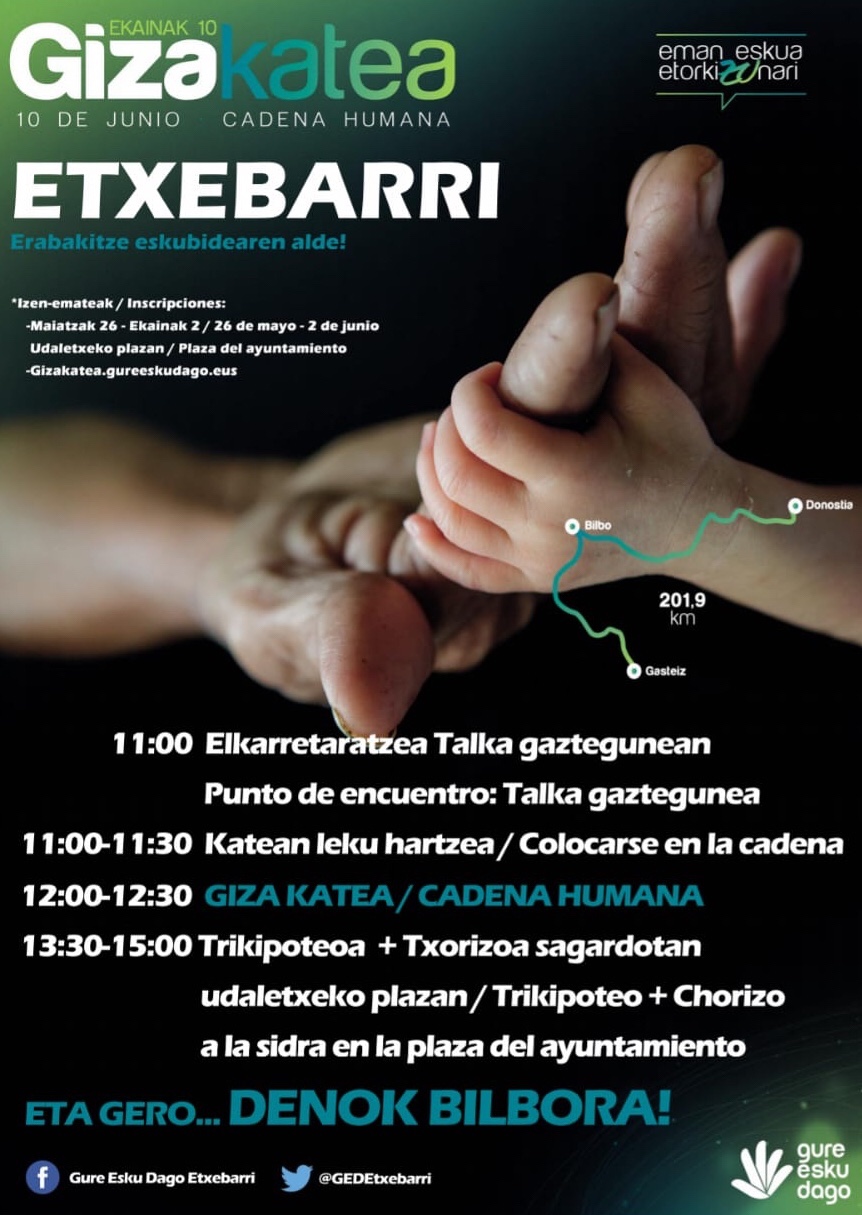 Ekimen nagusia -hau da, giza katea bera- 12:00etatik 12:30era bitartean izango da. Ondoren, 13:30etatik 15:00etara trikipoteoa eta txorizoa sagardoan dastatzekoa antolatu dute Etxebarrin, udaletxeko plazan. Arratsaldean Bilbora joateko deia zabaldu du Etxebarriko Gure Esku Dagok.