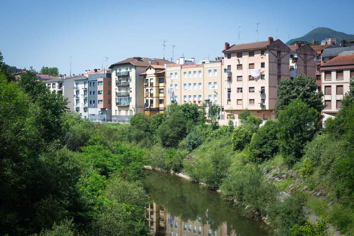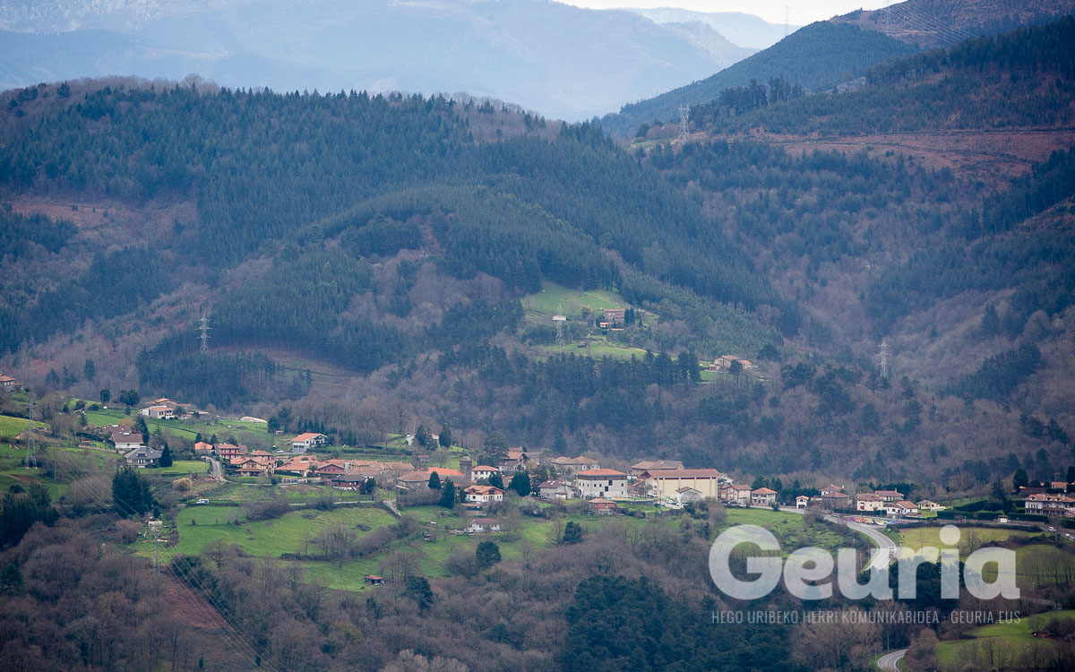 Zuhaitzen artean ageri diren teilatu gorrixkek, behean ibiltzen den errekatxoak eta urrunean doan kamioi-kate batek elkarrekin osatzen dute paisaia hori.