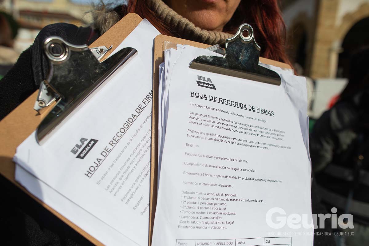 Egoerari konponbide bat emateko ahaleginetan, langileek sinadura bilketa bat hasi dute eskaera birekin: alde batetik, erizaintzako arreta eguneko 24 orduetan eskatzen dute. 24 orduetan kontratazioa hobetzea, gerokultore-, gaueko zeladore- eta garbiketa-ekipoen zuzkidura nahikoa, egonkorra eta iraunkorra bermatuz, gainkarga eta lan-karga murrizteko, lan-baldintzak hobetzeko eta egoiliarrei arreta duina eta kalitatezkoa bermatzeko.