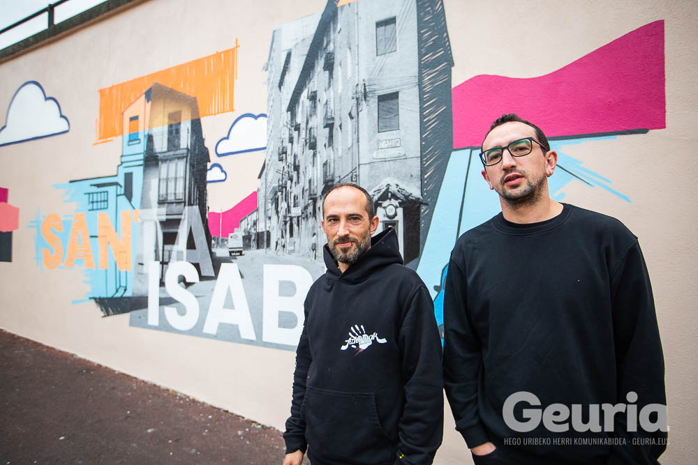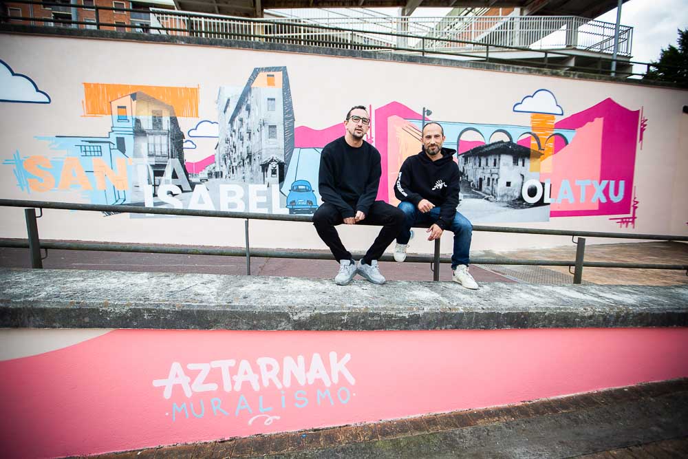 Aztarnak Muralismoko kide bientzat proiektu berezia izan da honako hau, Santa Isabel auzokoak direlako Ortiz eta Modrego. Horregatik egin dugu argazkia beren auzoko irudiaren aurrean: