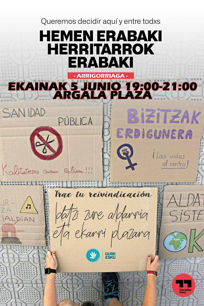 Gure Esku herri plataformak mobilizazioak deitu ditu asteburu honetan Euskal Herri osoan. ‘Hemen erabaki, herritarrok erabaki’ lelopean, ekitaldi ezberdinak egingo dituzte herri eta hiriburuetan. Arrigorriagan, gaur, ekainak 5, antolatu dute ekitaldia 19:00etatik 21:00etara Argala plazan. “Bakoitzak bere aldarria kartoi zati batean idatzi eta etxetik plazara eraman beharko du”, diote Arrigorriagako Gure Eskutik.