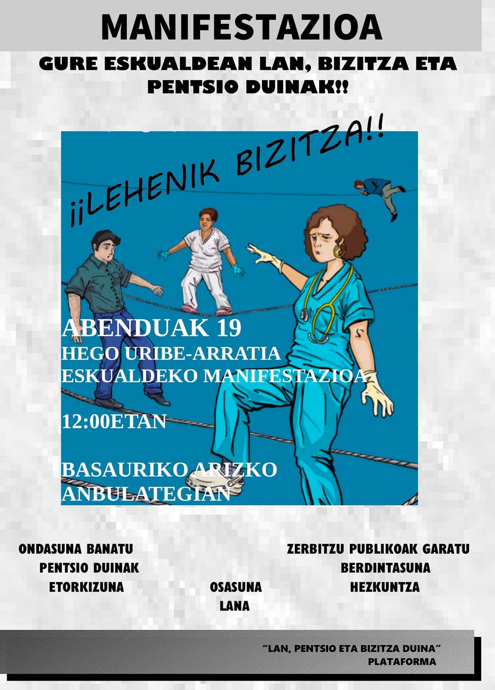 Abenduaren 19an lan, bizitza eta pentsio duinen aldeko manifestazioa deitu dute Basaurin Hego Uribeko eta Arratiako plataformek. Besteak beste, ondasunak banatzea, pentsio duinak, osasun publikoa, lana, zerbitzu publikoak garatzea, berdintasuna eta hezkuntza aldarrikatu dituzte. Manifestazioa 12:00etan hasiko da Arizko anbulatoriotik. Eskualdetik Arrigorriagako eta Galdakaoko herritarrak gerturatuko dira.