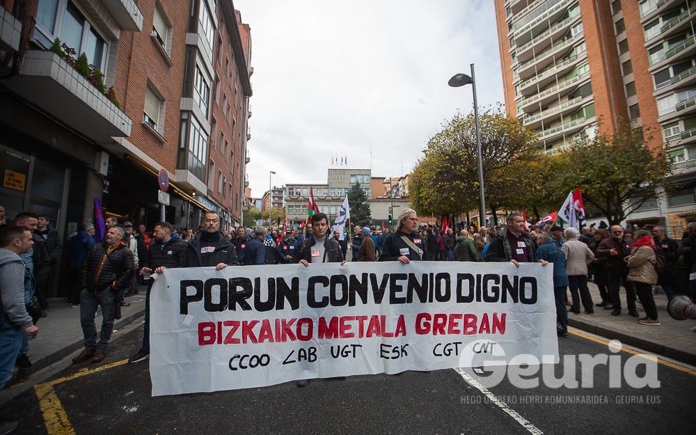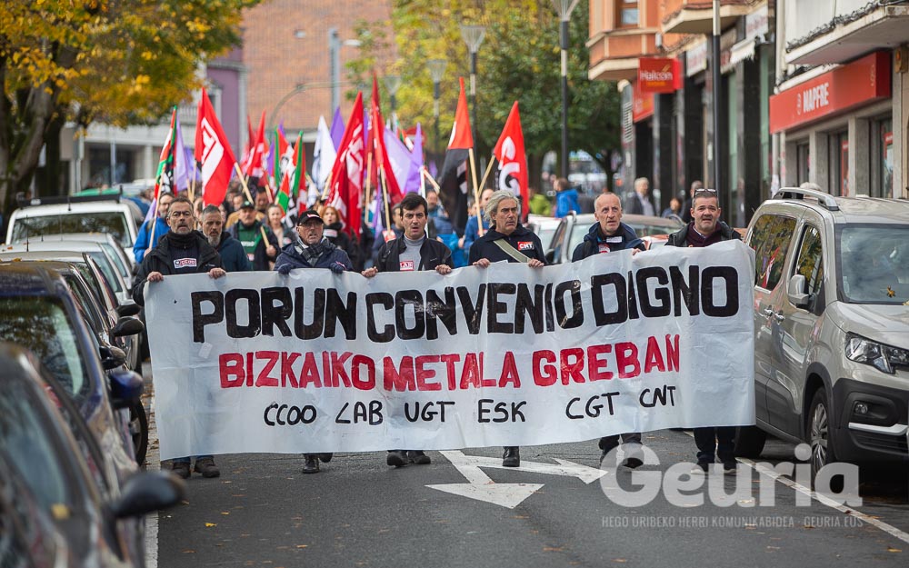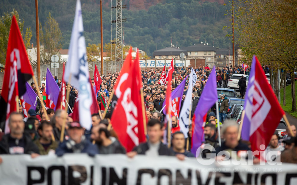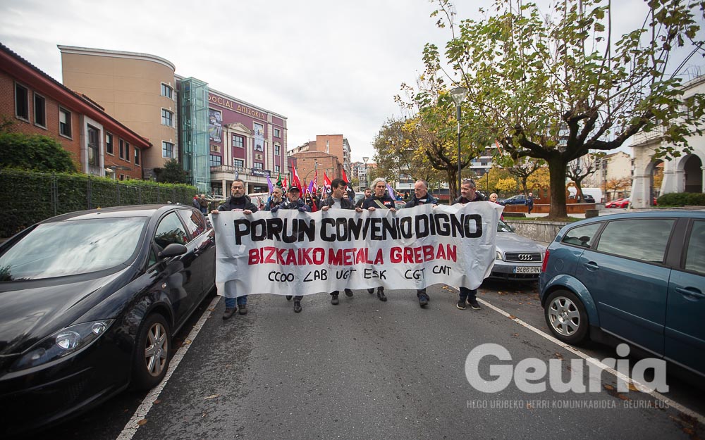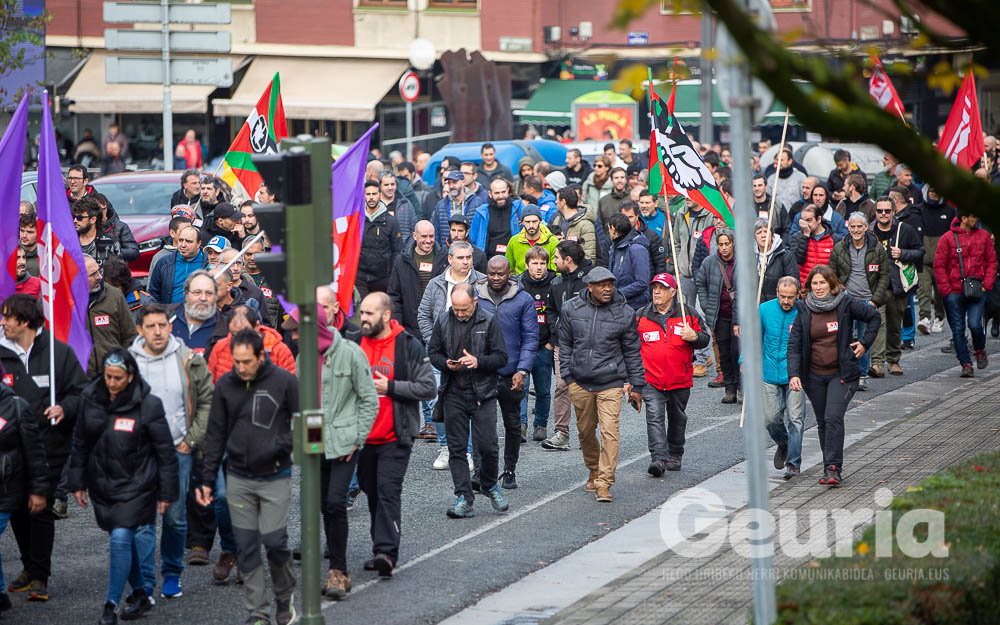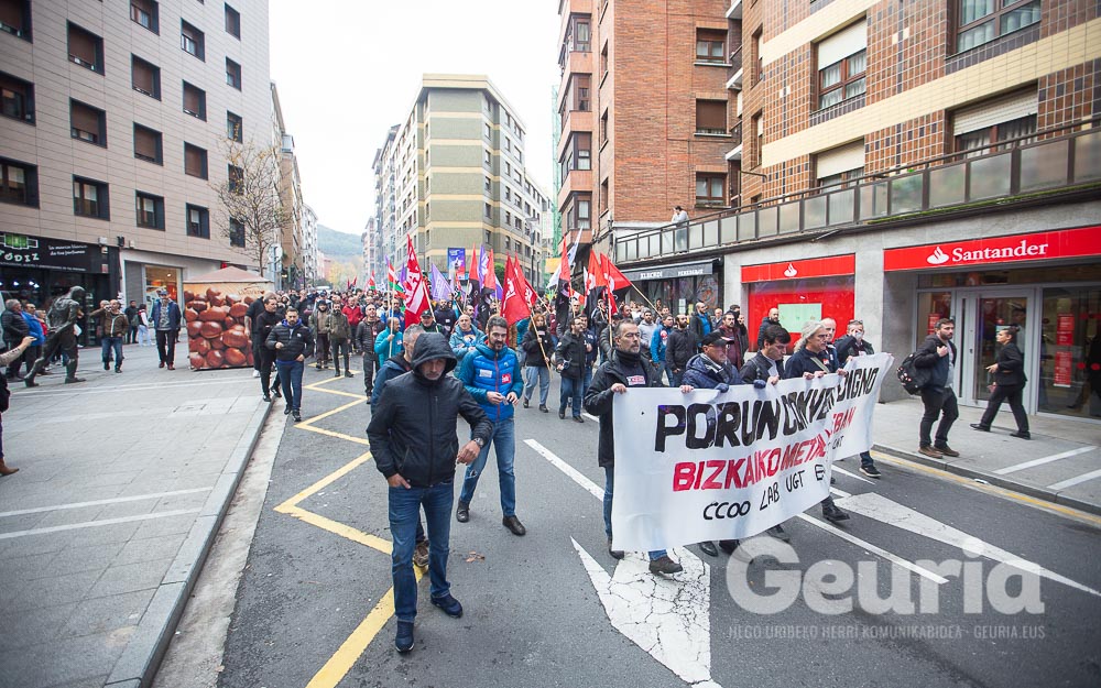 “Hitzarmen duin batengatik, Bizkaiko Metala greban” lemapean Basauriko kaleak zeharkatu dituzte. Bidean, petardoak sartu dituzte edukiontzietan eta horietako batek su hartu du begiratokietan. Ondorioz, Basauriko suhiltzaileen parkeko kamioi bat gerturatu da sua itzaltzera. Martxan “Hitzarmenik gabe bakerik ez”, “Urkullu, cabrón, trabaja como un peón” edo “Gora Bizkaiko metalaren borroka” bezalako ohiuak entzun dira.