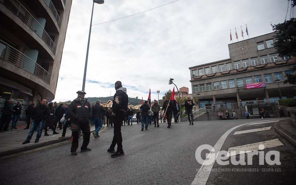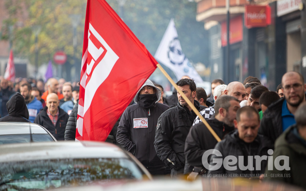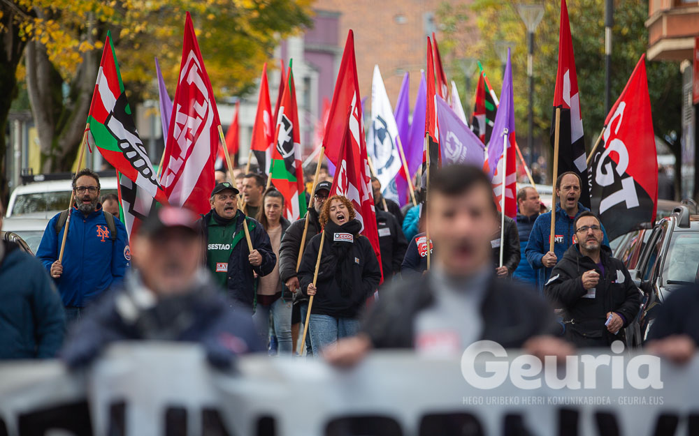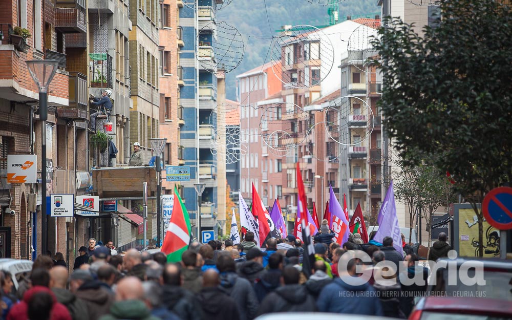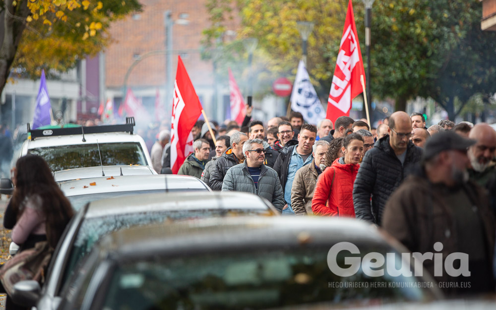 Milaka langilek parte hartu dute gaur CC.OO, LAB, UGT, ESK, CGT etaa CNT sindikatuek Basauriko udaletxetik Sidenor lantegiko sarrerara antolatu duten manifestazio zaratatsuan
