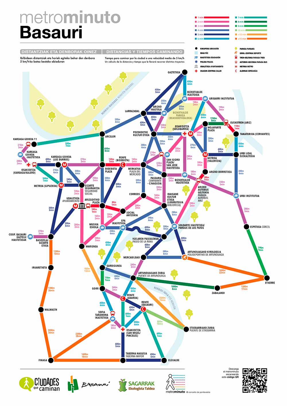“Metrominutuak ikusarazten digu zein denbora gutxi behar dugun eguneroko gure beharrizanak oinez egiteko: horietako asko 5-15 minutuko joan-etorrian egin ditzakegu, horixe baita Basauriko zerbitzu-puntu nagusietara (osasun-zentroak, ikastetxeak, merkataritza-zerbitzuak, eraikin publikoak, kultura-zentroak…) joateko behar den denbora”, dio Asier Iragorri Basauriko alkateak. Mapan zenbait ibilbide orduko 5 kilometroko abiaduran egiteko behar den denbora jaso dute, eta, iraupenaren arabera, kolore desberdinak dituzte bideek.