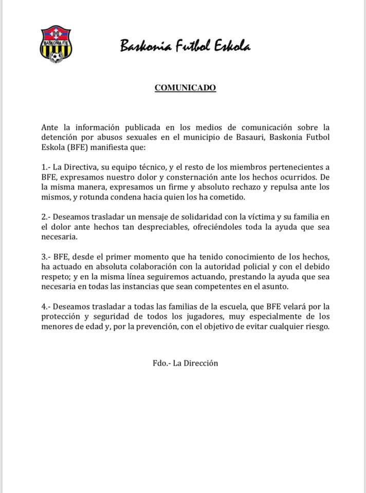 Lehen salaketaren bideoa publiko egin ondoren, azaroan, egin zuen publiko Basauriko Baskonia Futbol Eskolak orain arte egin duen adierazpen bakarra. Orduan elkarteko zuzendaritza batzordeko kide eta umeen entrenatzaile lanetan ari zen 60 urteko gizona atzo atxilotu zuen Ertzaintzak eta gaur egin du Eskolak bere bigarren adierazpena.