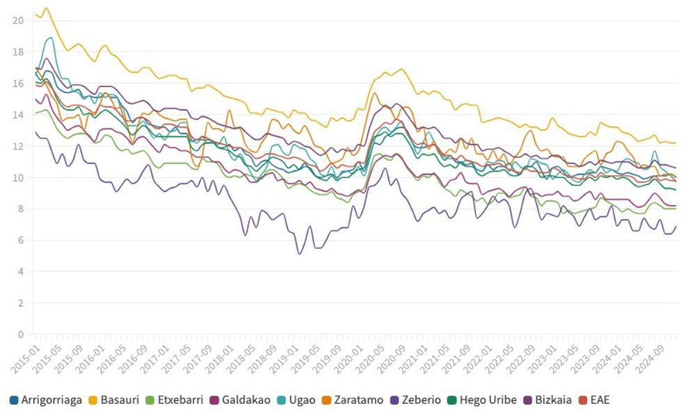 Hego Uribe eskualdeko langabezia-tasaren bilakaera 2015eko urtarriletik 2024ko abendura bitartean // Geuria