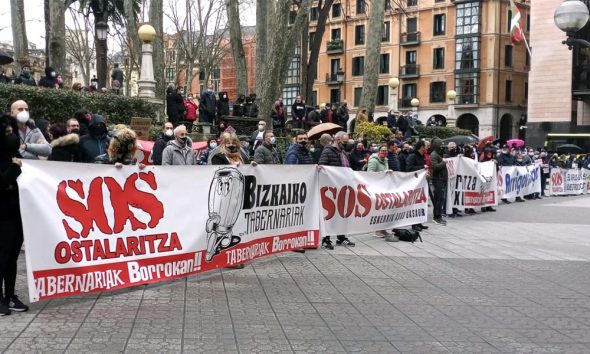 Bizkaiko ostalariek elkarretaratzea egin dute gaur goizean Bilbon, EAEko Justizia Auzitegi Nagusiaren aurrean, tabernak eta jatetxeak irekitzeko baimena ematea aldarrikatzeko.