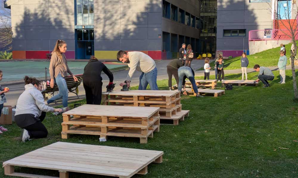 Hareontzia enpresek utzitako makina hondeatzaileagaz eta porlanagaz sortu zuten gurasoek. Gainera, nagusienen gelako terrazarako eserleku batzuk sortu zituzten palletak erabiliz. “Lanak amaitu ostean mokadutxoa hartzeko eta elkarrekin bazkaltzeko parada ere izan dogu, giro paregabean”.