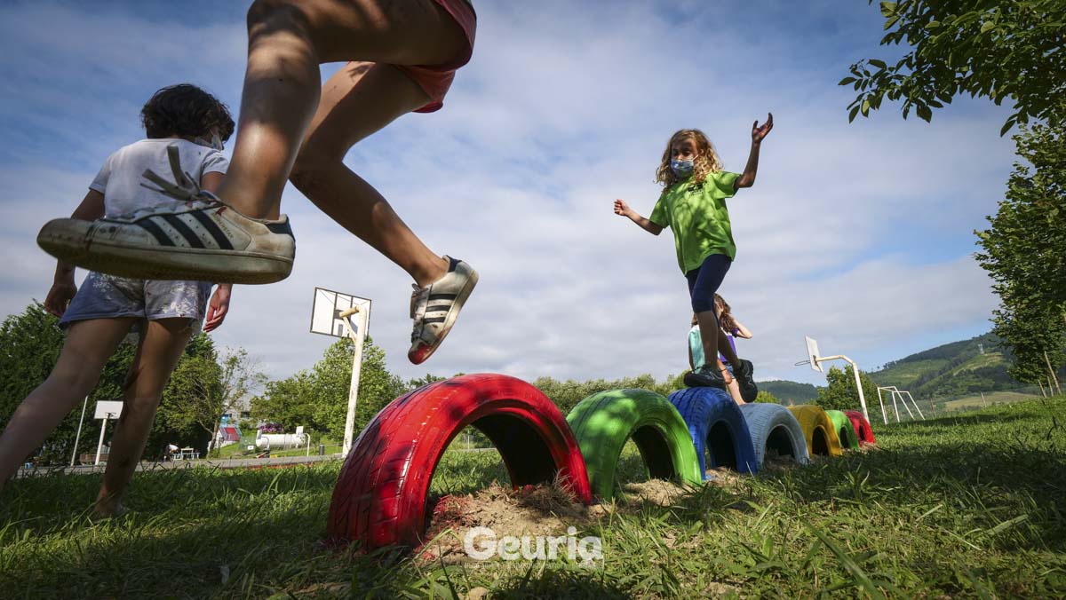 Haurrak, jolasgune berriko materialeak testatzen // Geuria