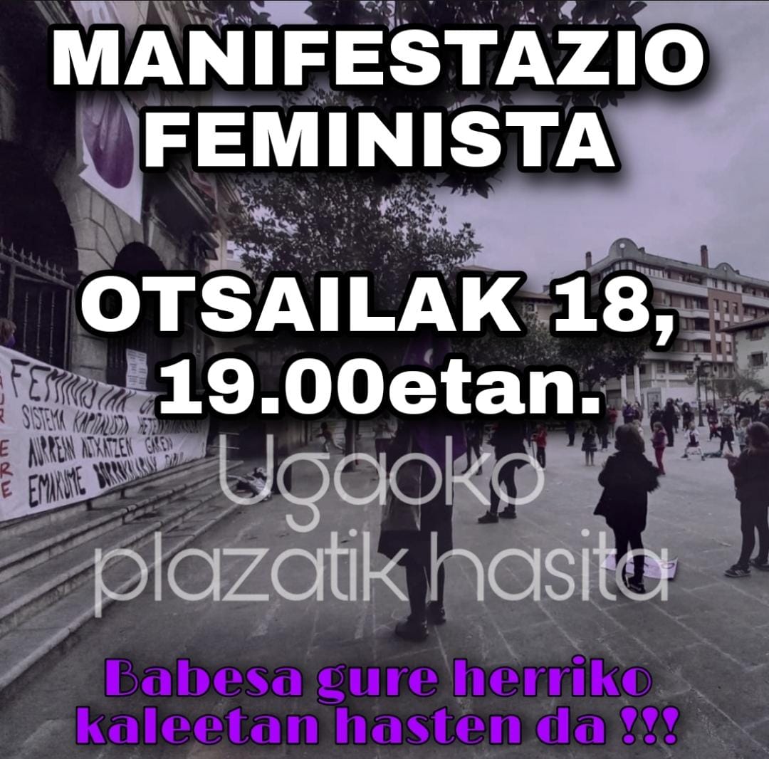 Ugaoko Mugimendu Feministak manifestazio feminista antolatu du bihar, otsailak 18, 19:00etan Herriaren plazan, joan den igandean herrian izandako eraso matxistagatik.
